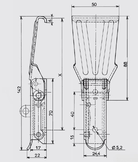 Fermeture à levier grenouillère métallique élastique à patte d'accrochage grand modèle avec porte cadenas - Effort maximum accepté de 350Kg