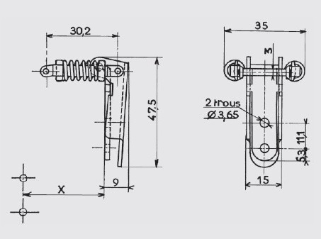 Fermeture à levier grenouillère métallique ressort petit modèle montage équerre avec biellettes latérales - Idéale pour résister aux vibrations - Effort maximum accepté de 30Kg